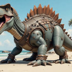A dramatic coastal scene features rugged rock formations in abstract colors, juxtaposed against a bright blue sky and gentle waves. Seagulls soar above, adding a dynamic touch to the landscape.