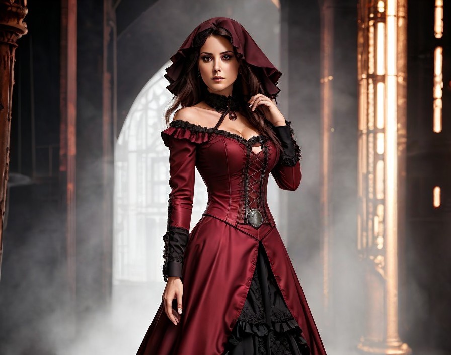 A woman in a Victorian-style red and black dress poses elegantly, holding up her hood in a foggy, ambient-lit corridor.