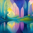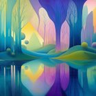 A vibrant, surreal landscape features towering trees in shades of blue and purple, softly lit by a pastel sunrise. A serene lake reflects the colorful scene, enhancing its dreamlike quality.