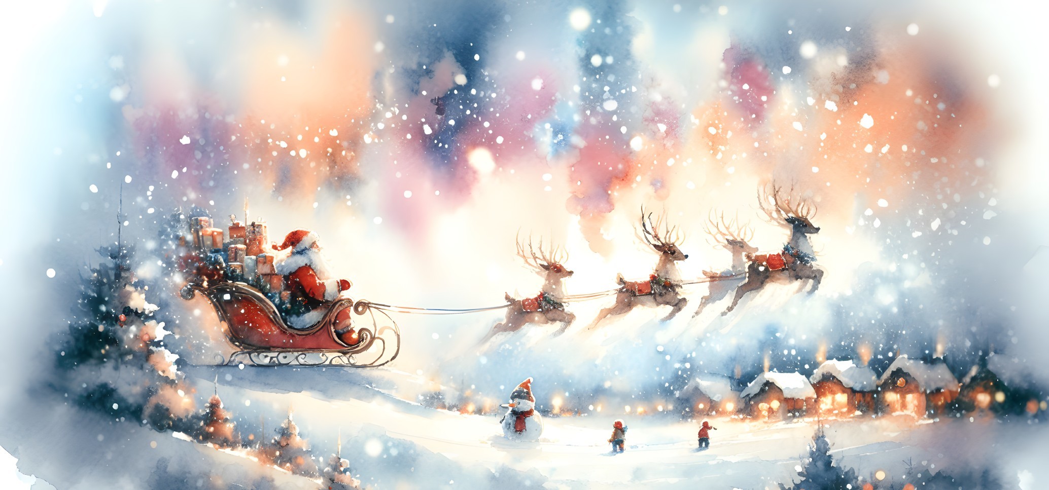 A festive scene depicts Santa Claus in a sleigh, flying through a snowy sky with reindeer. Below, children eagerly watch as snowflakes gently fall over quaint, illuminated cottages.