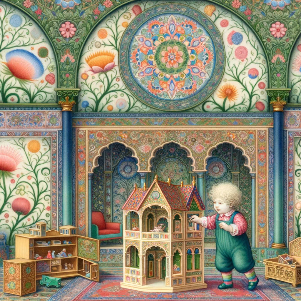 Prompt: Watercolor, piękna, adorable little girl playing with dollhouse in beautiful children's room with botanical patterns from the Voynich Manuscript, beautiful colors
