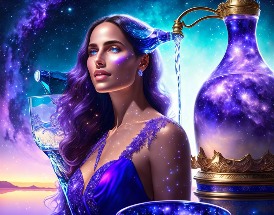 an angel pouring clear water on the earth from a starry bowl Aquarius Beautiful Lady, in blue and purple tones, against the background of the starry sky, art by Daniel Gerhartz & Anna Dittman elegant, sensuality, beautiful, highly detailed, high definition, dynamic lighting, intricate, very attractive