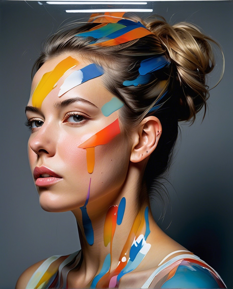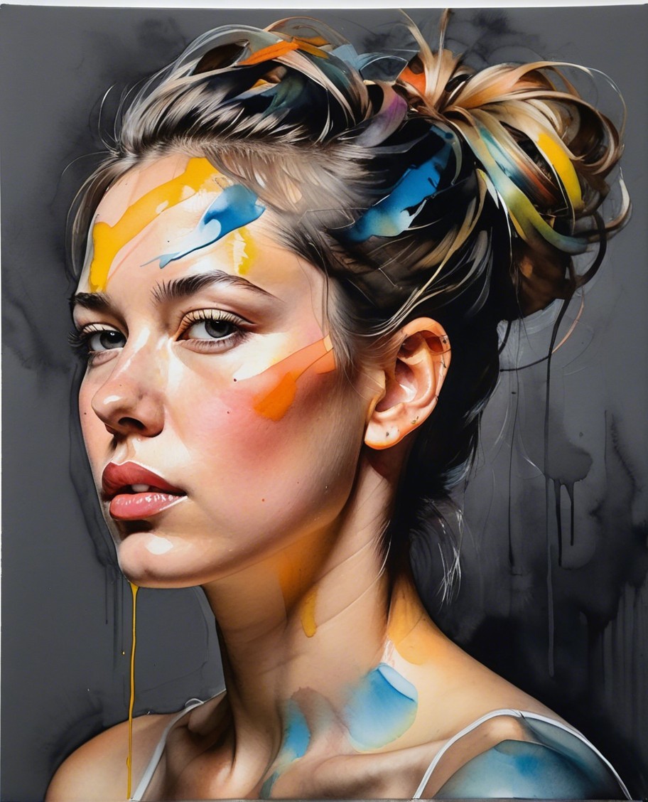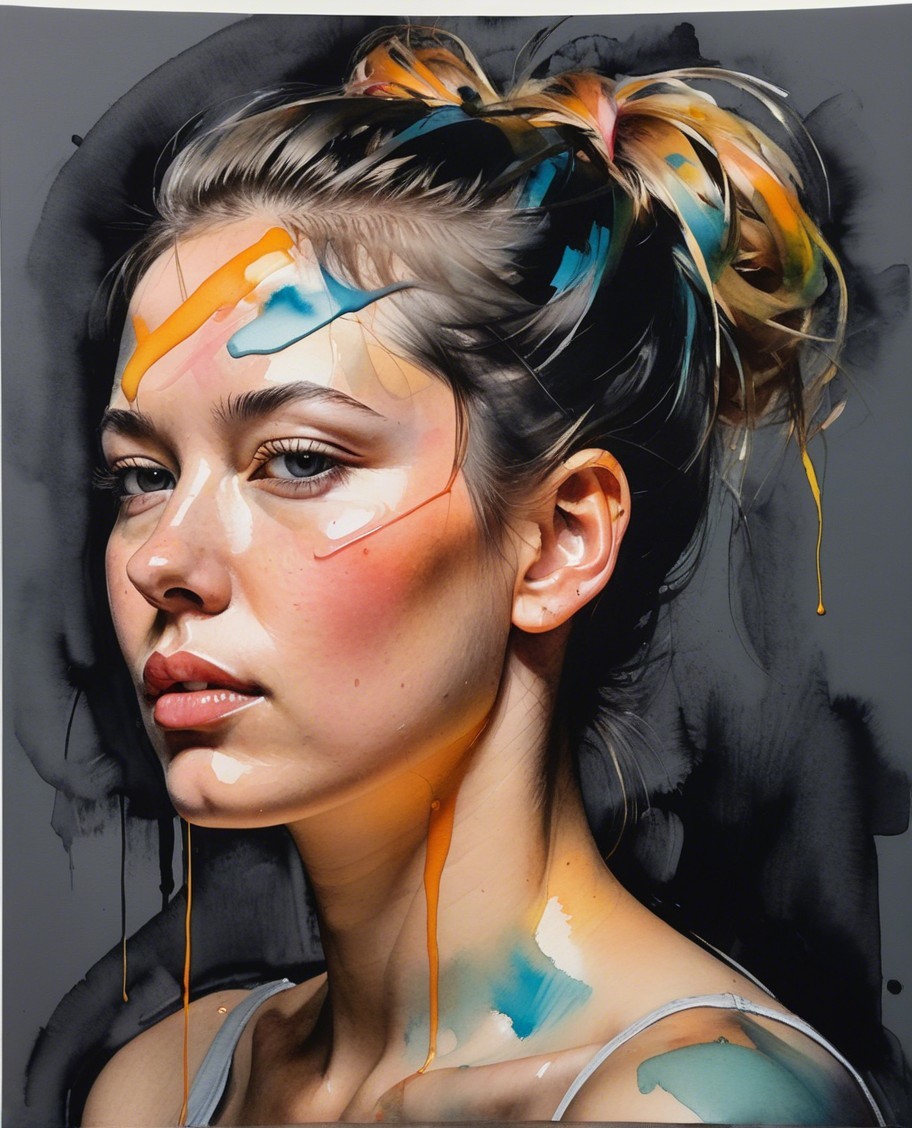 Vivid watercolor and ink portrait, stylized, overall style by Jenny Saville. Juvenile woman splashed in paint. Minimalism, surrealism, modern impressionism, dappled figurative art, dots, flecks, splashes, sketch book art, acrylic accents, pigments, soft charcoal, thinned oil painture, warm pastel coloring, hues and tints by Ho Baron and Jasper Johns, vivid, lively, uplifting, smooth reflective surfaces, elegant, ink painting rendered in plique-à-jour technique, dreamlike, (long-exposure photography, fragmented, contoured partially transparent, (textured background, (triadic color scheme green grey beige ,magical realism), brushstroke details, 7:11), anisotropic filtering, hallucinations). Reverse pathogen light, negative lucas numbers, invisible transitional aperture, sawtooth wave, LiDAR point cloud, hallucinogenic, grunge, acidic neonoir, convoluted, bubblegumstyle, gradient inking colors, cosmic energies, asymmetrical, swirling , brightness 1.4, visible textures, watercolor, pastel tones for128k render, volumetric lighting, maximalism, intricate details, dynamic color palette inspired by Marc Allante, crumbs, flecks, dots, quilling splashes, playful use of light by Kate Beaton and Kate Greenaway, surreal embodiment elements by Ho Baron and Laura Callaghan akin to Pendleton Ward, vast scale and profound depth by Devin Allen, surreal, vivid paint splatter, heavy impasto texture, dripping paint details, exceptional facial anatomy, intriguing composition, dynamic brush strokes, vibrant color palette, expressive emotions, detailed features, high-resolution digital painting, contemporary style, dramatic lighting, artistically striking, immersive depth, bold contrasts, captivating visual impact by visible textures, post-avantgarde, ultra 3-dimensional effect for immersive volumetric lighting, dramatic ambiance, cutting-edge AI art for highest quality output, vivid colors, bright diffuse lighting, opaque pointilism details, ambient occlusion, 3-dimensional. warm colored, visible textures inspired by Darren Waterstron and Man Ray, textured hues reminiscent of Overton Loyd, digital illustration, intricate and detailed, bright, contrasting color scheme,