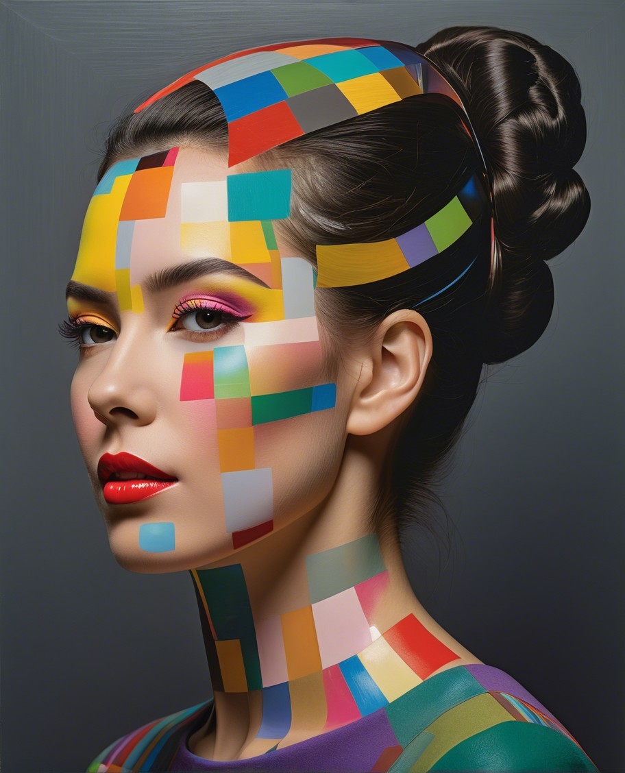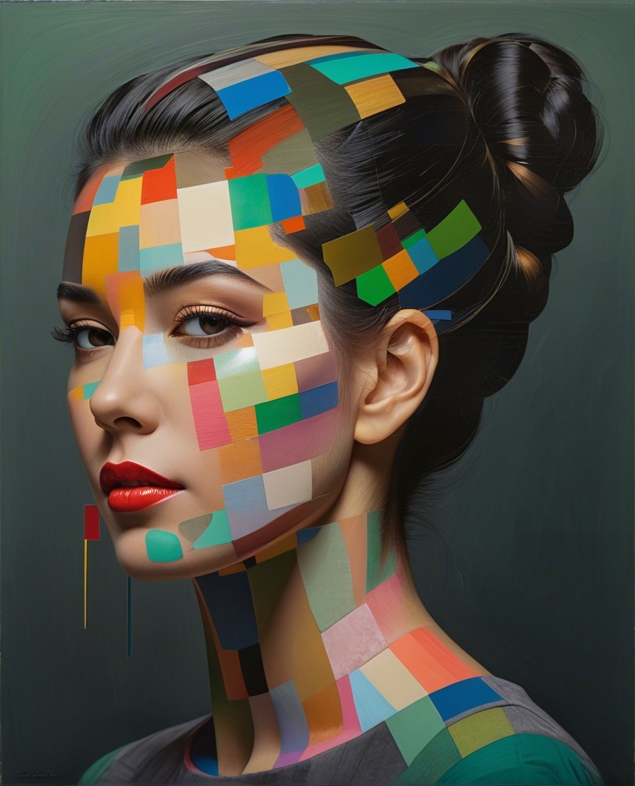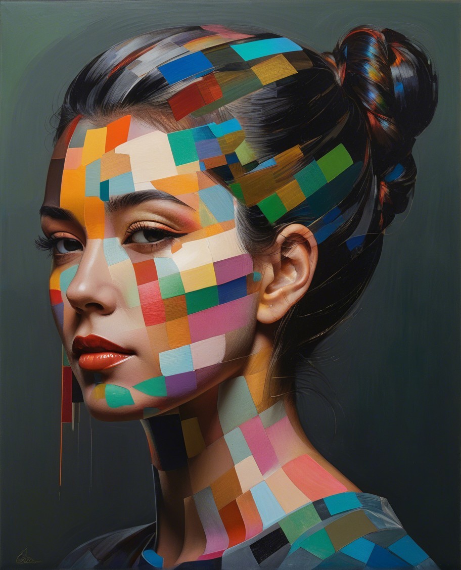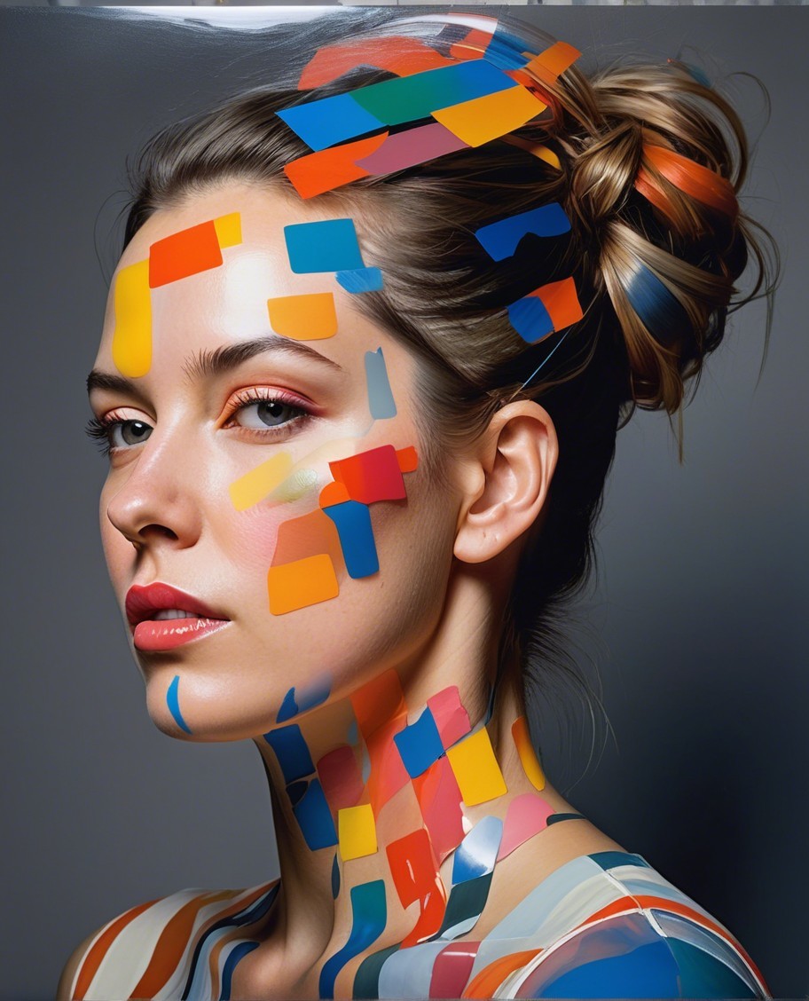 Vivid watercolor and ink portrait, stylized, overall style by Jenny Saville. Juvenile woman splashed in paint. Minimalism, surrealism, modern impressionism, dappled figurative art, dots, flecks, splashes, sketch book art, acrylic accents, pigments, soft charcoal, thinned oil painture, warm pastel coloring, hues and tints by Ho Baron and Jasper Johns, vivid, lively, uplifting, smooth reflective surfaces, elegant, ink painting rendered in plique-à-jour technique, dreamlike, (long-exposure photography, fragmented, contoured partially transparent, (textured background, (triadic color scheme green grey beige ,magical realism), brushstroke details, 7:11), anisotropic filtering, hallucinations). Reverse pathogen light, negative lucas numbers, invisible transitional aperture, sawtooth wave, LiDAR point cloud, hallucinogenic, grunge, acidic neonoir, convoluted, bubblegumstyle, gradient inking colors, cosmic energies, asymmetrical, swirling , brightness 1.4, visible textures, watercolor, pastel tones for128k render, volumetric lighting, maximalism, intricate details, dynamic color palette inspired by Marc Allante, crumbs, flecks, dots, quilling splashes, playful use of light by Kate Beaton and Kate Greenaway, surreal embodiment elements by Ho Baron and Laura Callaghan akin to Pendleton Ward, vast scale and profound depth by Devin Allen, surreal, vivid paint splatter, heavy impasto texture, dripping paint details, exceptional facial anatomy, intriguing composition, dynamic brush strokes, vibrant color palette, expressive emotions, detailed features, high-resolution digital painting, contemporary style, dramatic lighting, artistically striking, immersive depth, bold contrasts, captivating visual impact by visible textures, post-avantgarde, ultra 3-dimensional effect for immersive volumetric lighting, dramatic ambiance, cutting-edge AI art for highest quality output, vivid colors, bright diffuse lighting, opaque pointilism details, ambient occlusion, 3-dimensional. warm colored, visible textures inspired by Darren Waterstron and Man Ray, textured hues reminiscent of Overton Loyd, digital illustration, intricate and detailed, bright, contrasting color scheme,