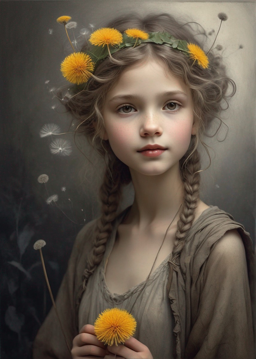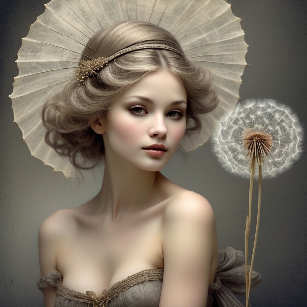 A young woman with voluminous hair holds a large, delicate dandelion puff close to her face, evoking a soft, dreamy ambiance.