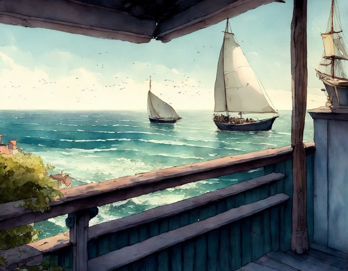 Prompt: "Painting of a balcony with a view of the ocean and a sailboat in the distance, Anton Pieck, Cute and adorable cartoon, fantasy, dreamlike, surrealism, super cute, trending on artstation, cute, funny, centered, award winning watercolor pen illustration, detailed, disney, isometric illustration, drawing, by Stephen Hillenburg, Matt Groening, Albert Uderzo"