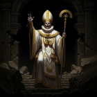 A towering figure in ornate white robes and a golden staff stands in a dark, crumbling setting. The majestic yet eerie presence suggests a powerful, perhaps ominous, figure of authority.