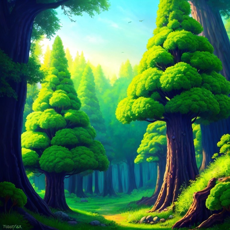 A serene forest glade with sunlight filtering through, highlighting a graceful deer among vibrant green trees and oversized mushrooms.