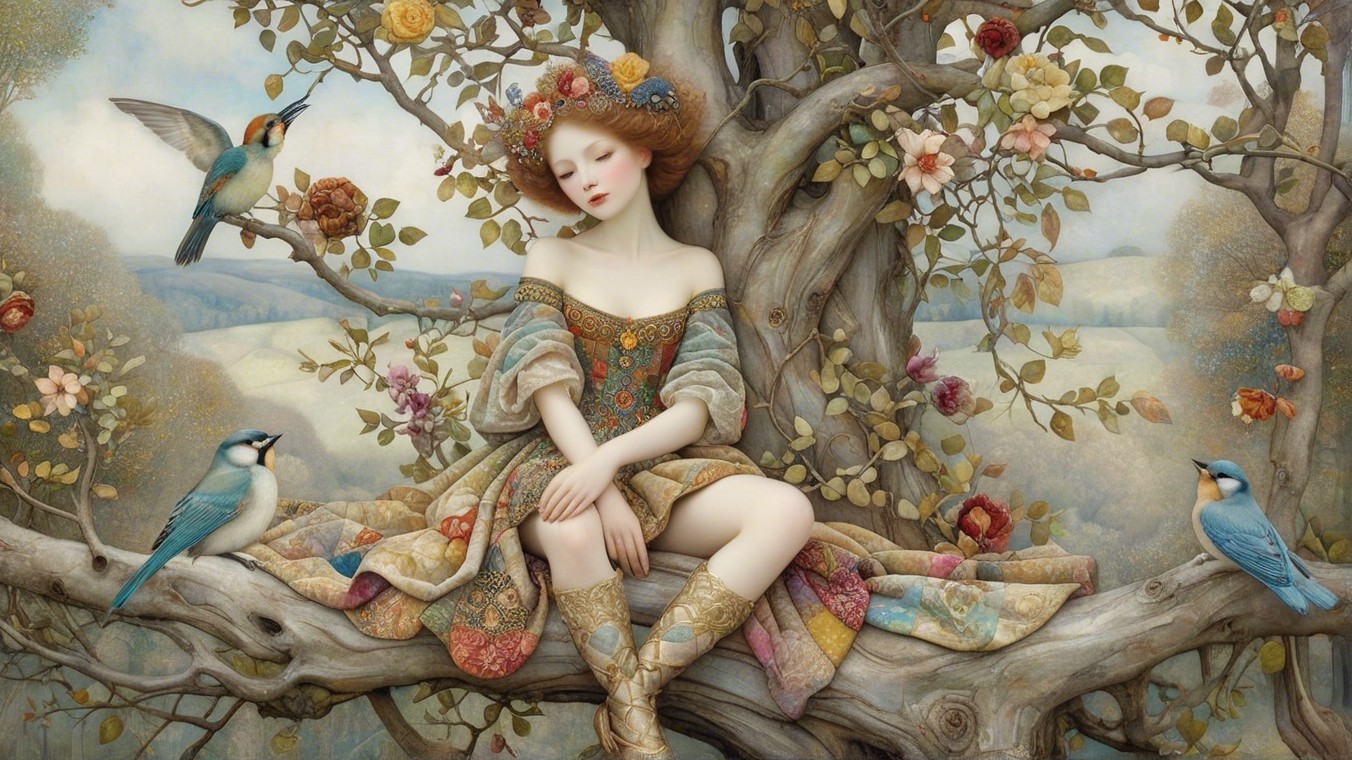 A serene figure with flowing red hair sits gracefully on a tree branch, adorned in a colorful dress and floral crown, surrounded by lush leaves and a misty landscape. Dreamlike and enchanting.