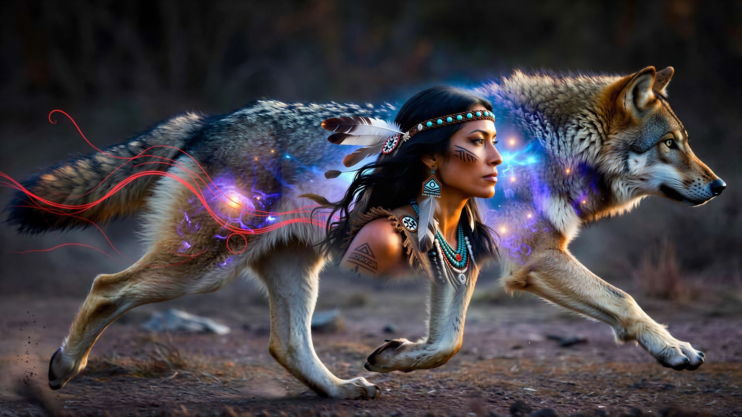 A fantasy portrait of a shamanic woman in profile with long dark hair, wearing a feathered and beaded headband, face paint on her cheeks, statement earrings, and multiple beaded necklaces, her face and body emerging from the center of a wolf running in profile, creating a composite creature that is half woman and