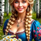 A young woman with braided blonde hair and bright blue eyes smiles warmly, surrounded by vibrant sunflowers and a lush, green landscape in a sunny, serene setting.