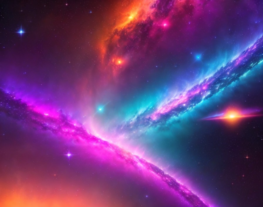neon space scene, where the cosmos comes alive with vibrant hues and luminous radiance. Describe the cosmic expanse as an electric canvas, where swirling nebulae paint the background in shades of vivid purples and deep blues. Detail the neon stars that flicker like celestial beacons, casting their vibrant glow across the vast, interstellar void.