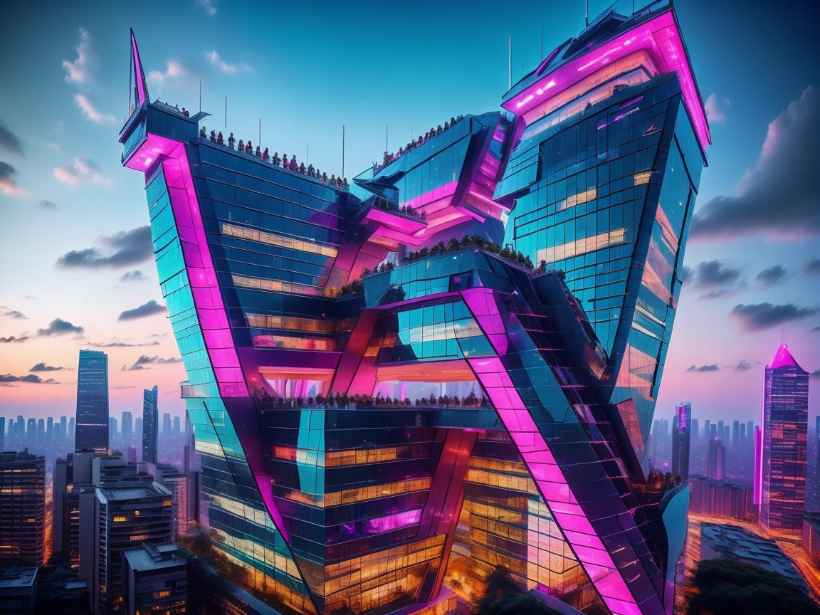 The image showcases a futuristic skyscraper with a vibrant, twisting design illuminated by pink and blue lights. Surrounding it are sleek, modern buildings against a colorful sunset sky.