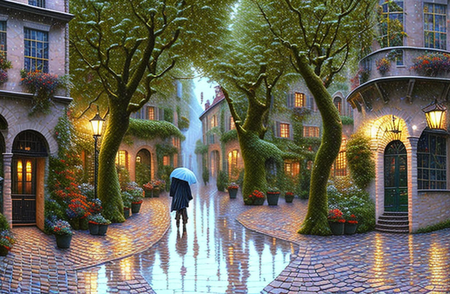 A rain-soaked cobbled street, in a picturesque сity, lights in the windows, trees along the street, very subdued light meticulously detailed, hyperrealistic, intricate painting by Guido Borelli da Caluso, Ferdinand Knab, Ernst Haeckel. Depth of field, distant mist, elegant fantasy attractive beautiful fantastic view crisp