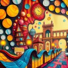 This vibrant artwork features a whimsical interior with bold colors, abstract shapes, and playful elements like a piano, clocks, and floating circles, creating a dreamlike, imaginative atmosphere.