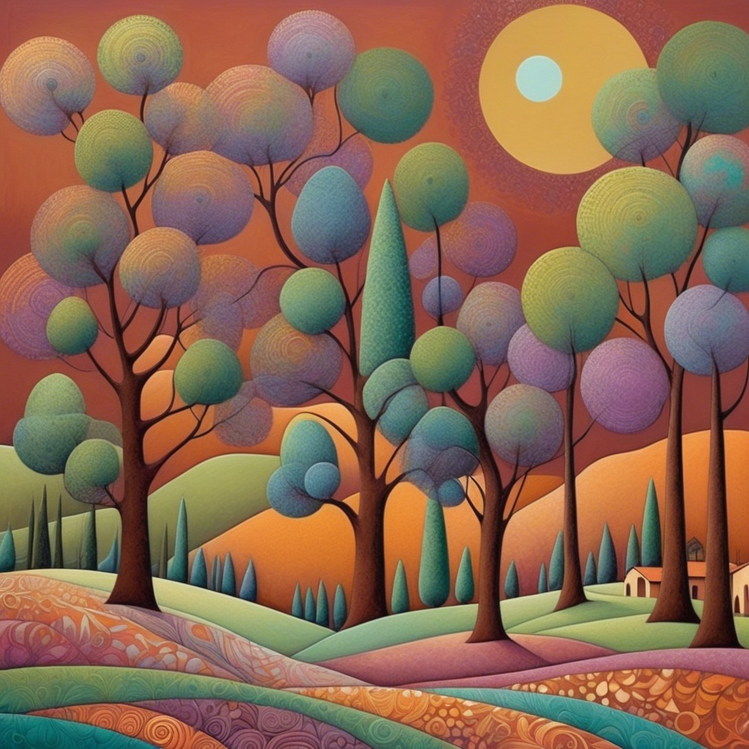A vibrant landscape features stylized trees with bold colors, rolling hills, and a quaint house under a warm sun. The whimsical design uses rich tones of orange, green, and purple for a playful feel.