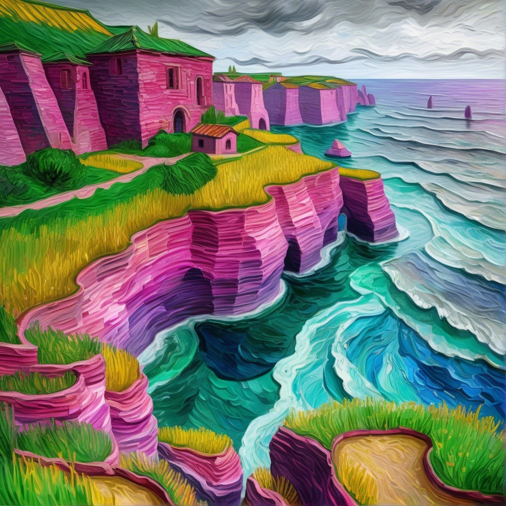 A vibrant landscape featuring cliffs and waves in dynamic colors. A charming building sits on the edge, surrounded by lush greenery and a dramatic sky filled with swirling clouds and sunlight.