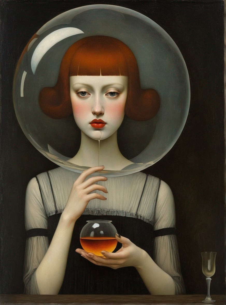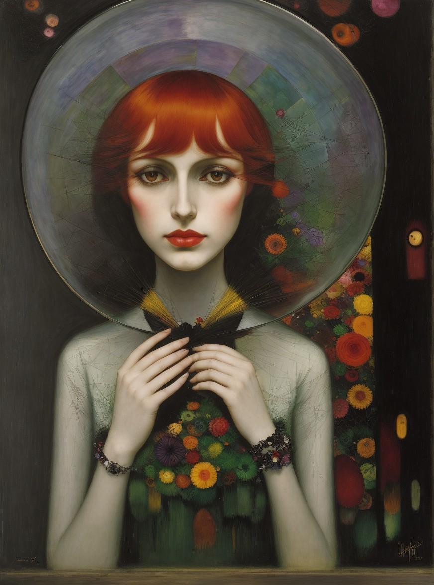 A stylized portrait of a woman with a bob haircut, pale skin, red lips, and an enigmatic expression, against an abstract background.