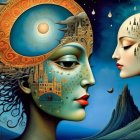 The image depicts a surreal woman adorned with vibrant blue makeup and jeweled accessories, set against a cosmic backdrop featuring a crescent moon, two suns, and a mystical landscape.