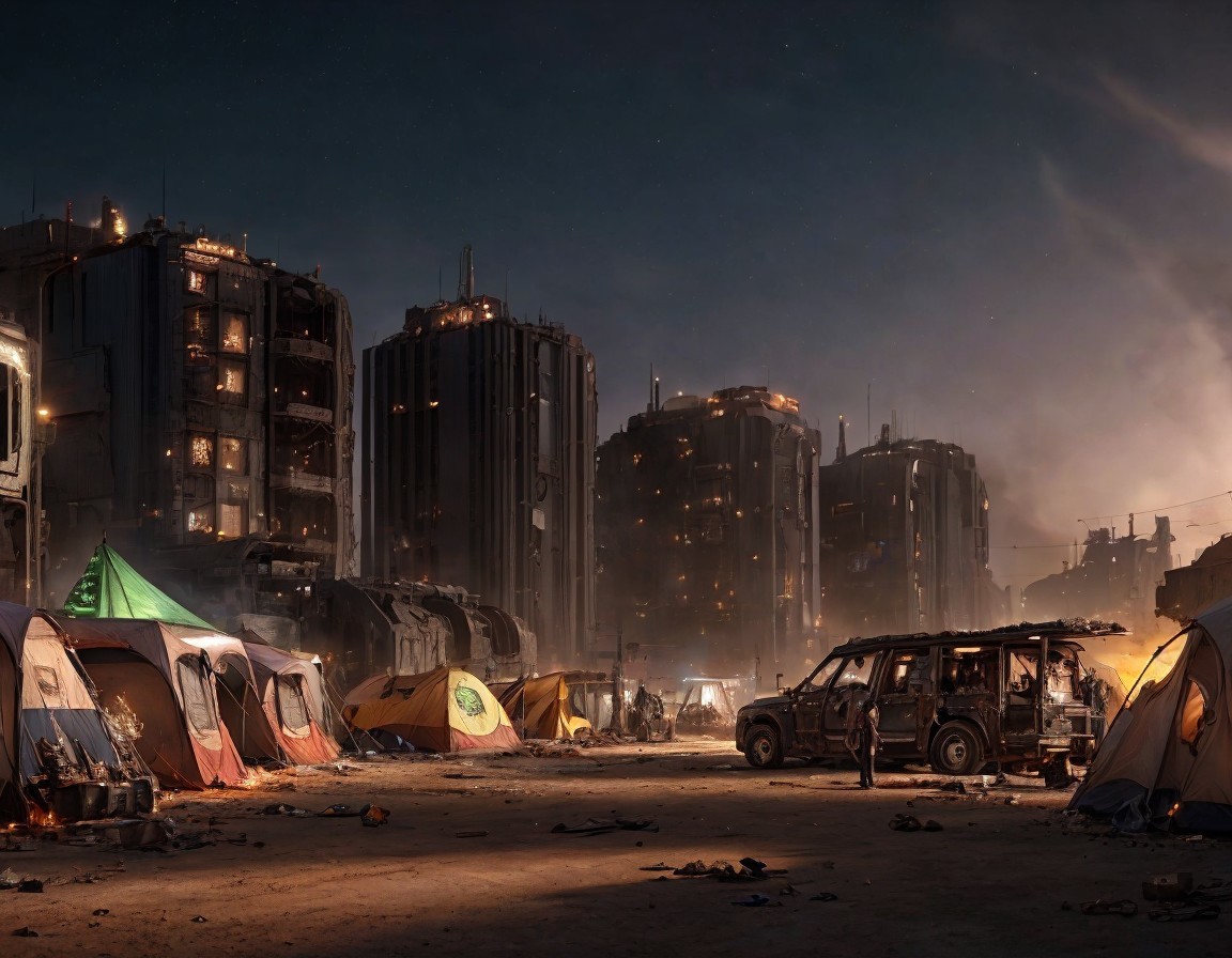 A futuristic spaceport with rockets launching amid a rocky alien landscape under a twilight sky.