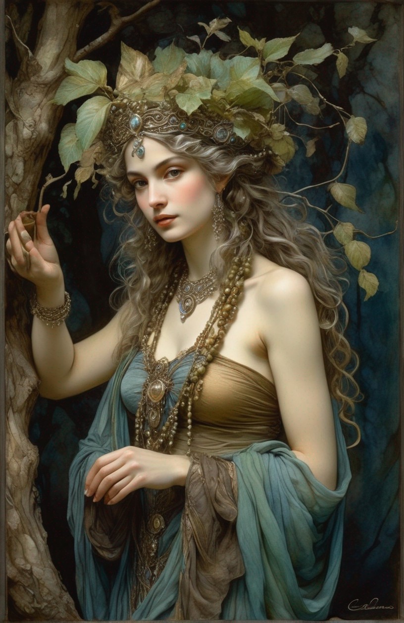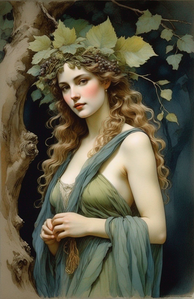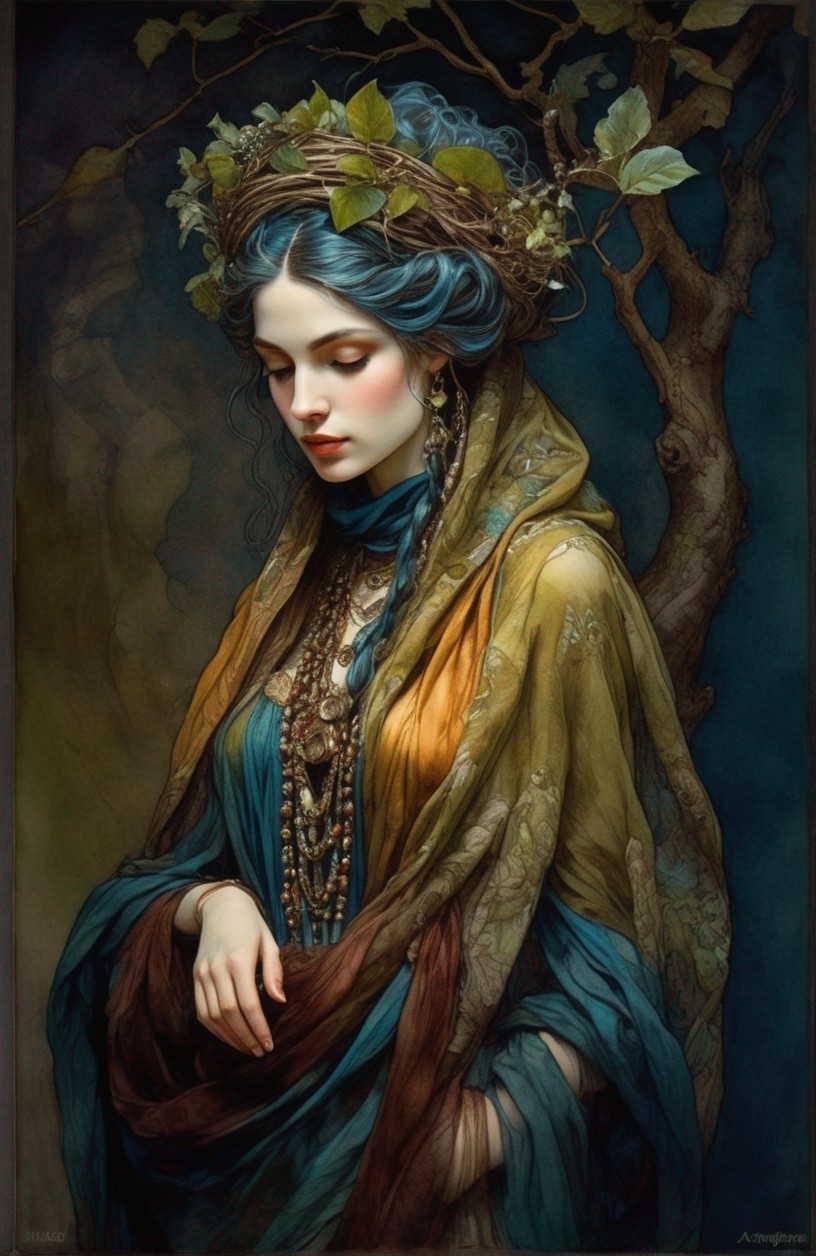 : Beautiful woman in the style of WALTER MARTIN BAUMHOFER and rené gruauMorea is the name of another female dryad that lives on mulberry trees.Dryad priestess in flowing shawls, colored ink drawing, watercolor artwork on old withered paper, vintage, by Caravaggio, Fragonard, Anton Pieck, pale colors, high detail, intricately detailed, hyperdetailed volumetric lighting, art nouveau graphic steampunkwhimsical, beautiful, poignant, touching. colors rose, gold, rust, burgundy, black. soft watercolor extra water in Art Deco by Annigoni, Egon Schiele, Milo Manara, Botticelli, Catrin Welz-Stein, Jean Metzinger, Klimt, perfect eyes, perfect handsface, highly detailed, complementary colors, hyper detailed. Watercolor and ink splatter, dynamic pose, dark blue background, unreal engine, greg rutkowski, loish, rhads, beeple, makoto shinkai and lois van baarle, ilya kuvshinov, rossdraws, tom bagshaw, alphonse mucha, global illumination, detailed and intricate environment Modifiers:dramatic Van Gogh Arthur Rackham Gothic Paul Klee pen and ink dreamy anatomically correct Edward Gorey disturbing metallic colors forboding Esao Andrews biomorphic hallucinatory DZO:Olivier Dorota Piotrowiak