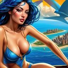 The image features a stunning woman with flowing blue hair, wearing a bikini, set against a vibrant backdrop of a sunny beach and a colorful city skyline. The scene evokes a feeling of summer and freedom.