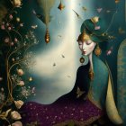 A serene figure sits gracefully against a mystical backdrop, adorned in vibrant attire. Butterflies flutter around her, while delicate blossoms frame the scene, creating a dreamlike atmosphere.