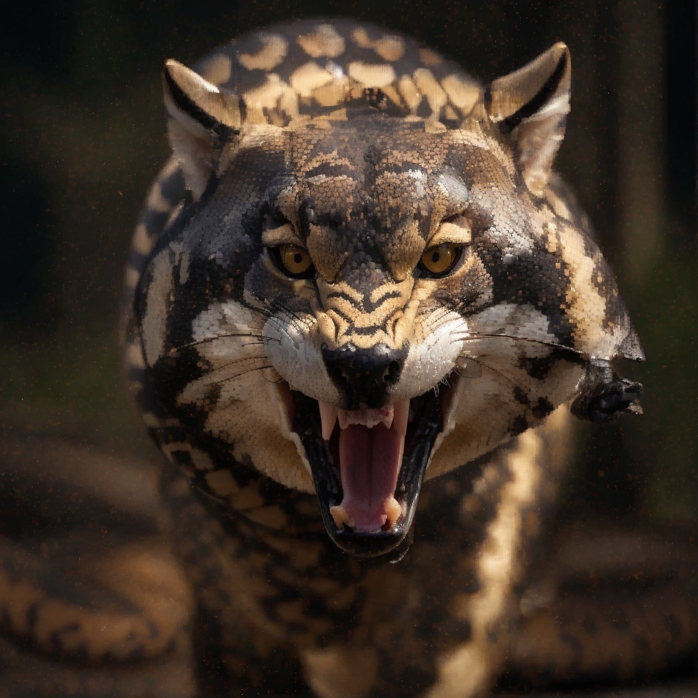 + Prompt:Create an image of a King Cobra in a striking pose with the following characteristics: The cobra has a smooth, shiny golden-tan scaled skin with a distinctive hood expanded, displaying dark brown and black mottled patterns on the interior. Its eyes are black with a focused, intense gaze, and the snake has a small, rounded snout. The cobra's forked tongue is a deep red with blue-gray accents, prominently flicking out from its mouth. Focus on the texture and sheen of the scales and the intimidating stance of the cobra. The background is a soft, blurred natural environment with neutral earthy tones that complement but do not overpower the subject.