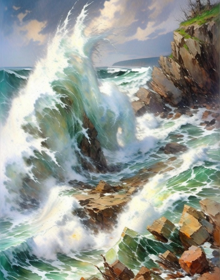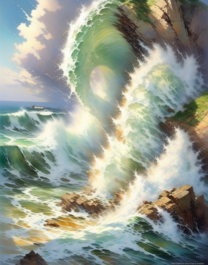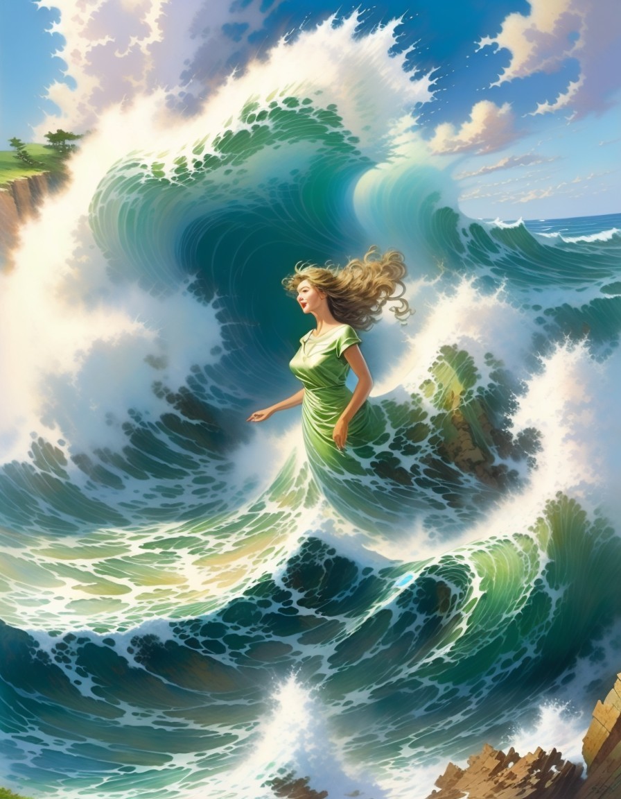 a beautiful woman emerging from the rock and the crashing wave. Her face is angelic and her dress is made of the rolling wave of the sea.
