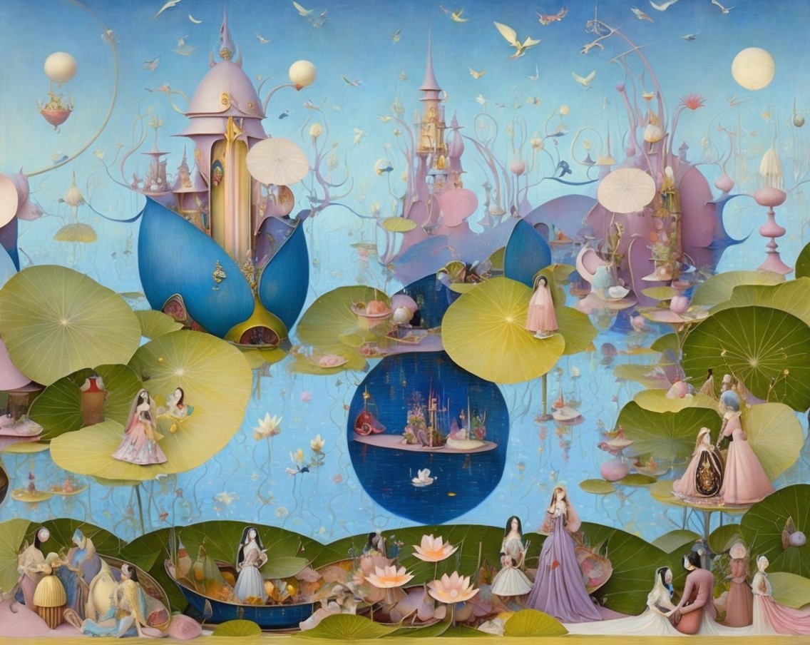 A vibrant, surreal landscape features whimsical towers and floating orbs, surrounded by lush greenery and a serene waterway, all under a bright blue sky dotted with birds and abstract forms.