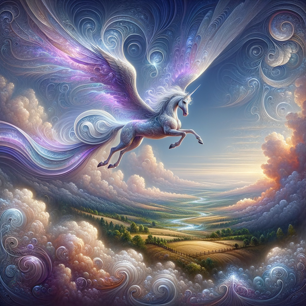 Prompt: "If Pegasuses were real, luminous trails of Water Calligraphy would probably flows behind as they gracefully soared through the cloud.