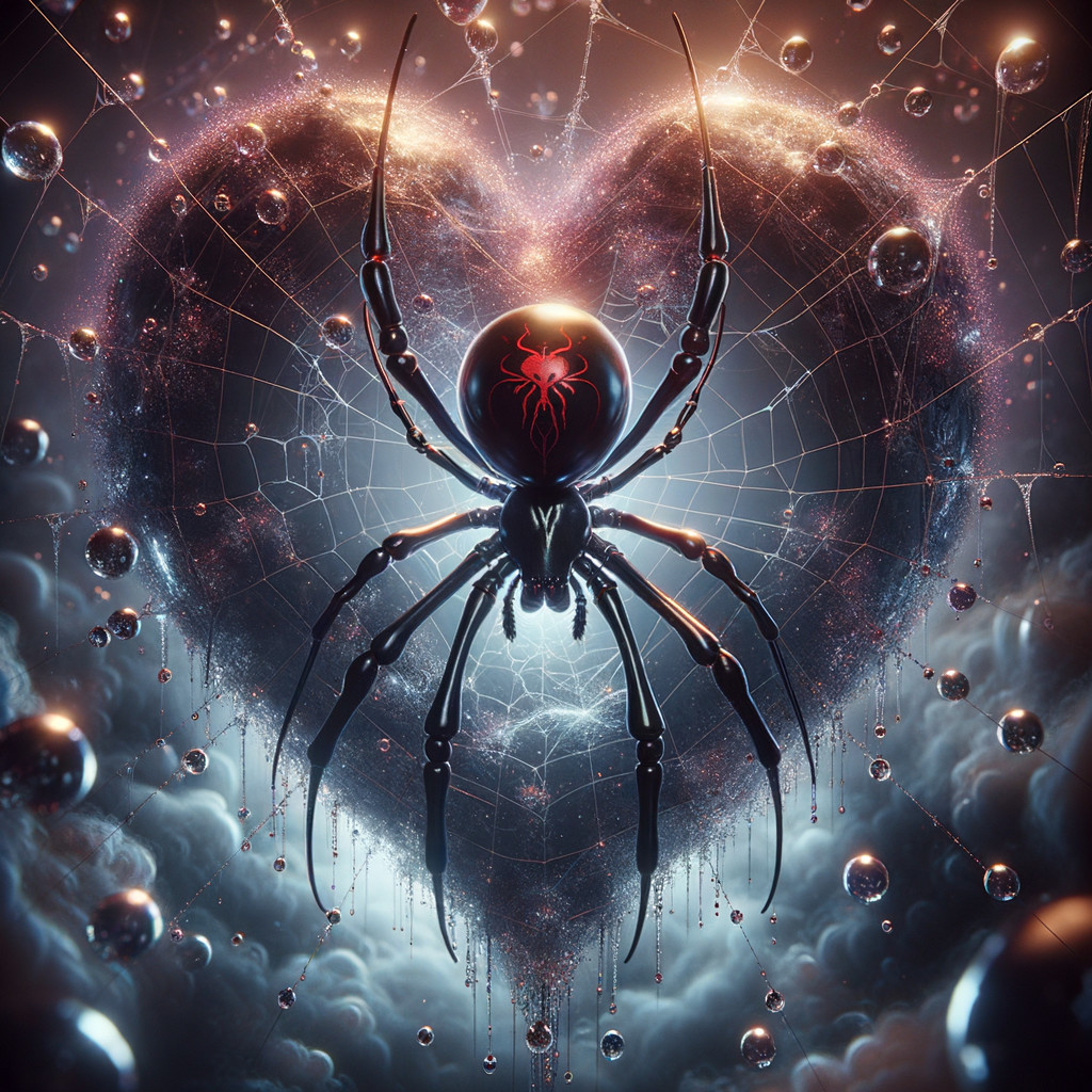 Prompt: ""Weird Science" a beautiful yet ominously eerie Latrodectus spider positioned at the center of my glossy black heart. long, slender legs with detailed venous vasculature. The spider's characteristic bright red hourglass marking is a multicellular organic neural network prominently displayed on the ventral side of its bulbous abdomen. Its overall body shape is compact yet arachnoid, with a clear distinction between the cephalothorax and intricate venous vasculature of the abdomen. The creature is poised within a delicate web that clings to an invisible, nondescript surface marbled with subtle refractions of light rays. Soft lighting reveals the intricate details of the spider's morphology and the gossamer strands of its web which glisten slightly, giving a sense of both fragility and danger but mostly impending death. The spider occupying the lower half of your cold heart, lives in nitrogen-oxygen atmosphere creating a strong sense of looming presence and an eternally dark hollow place inside your soul"