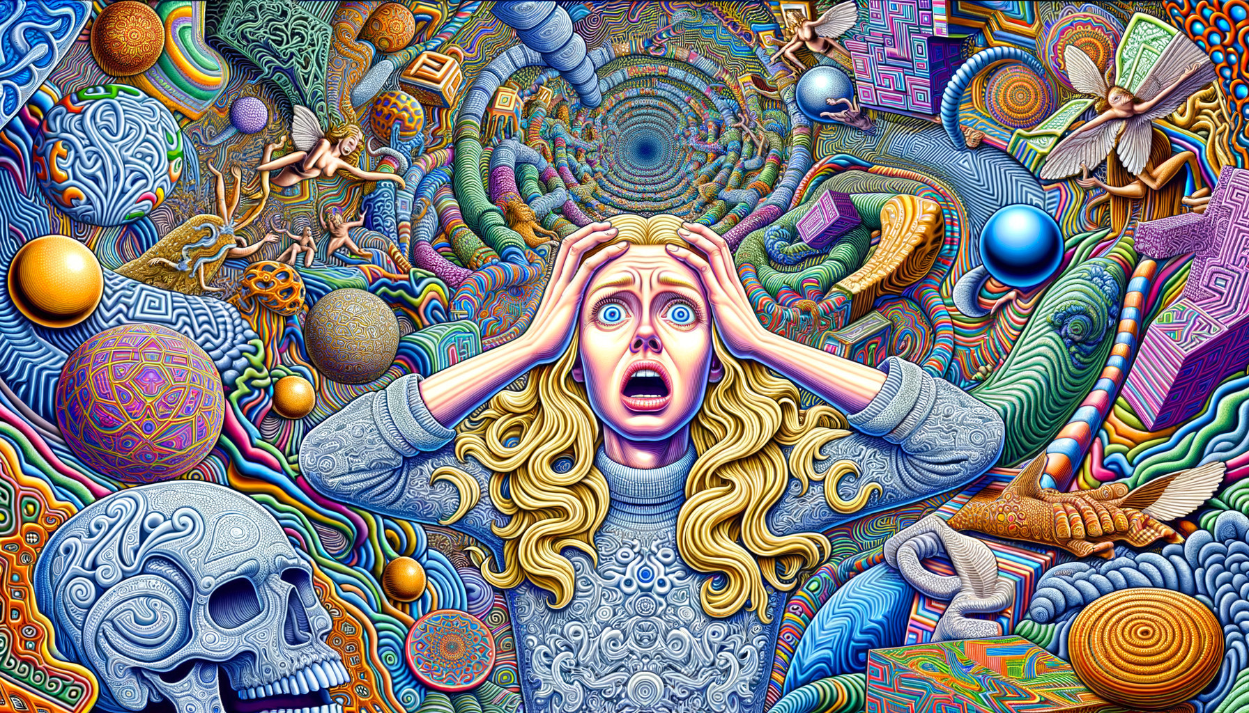 Prompt: "a DMT trip through an intricate psychedelic maze filled with colorful pop culture icons, a blond-haired woman, ice blue eyes, pale lips, funny and realistic screaming in terror while holding her head, trippy patterns and visual surrealism, vector art, colorful, highly detailed, in the style of superflat"