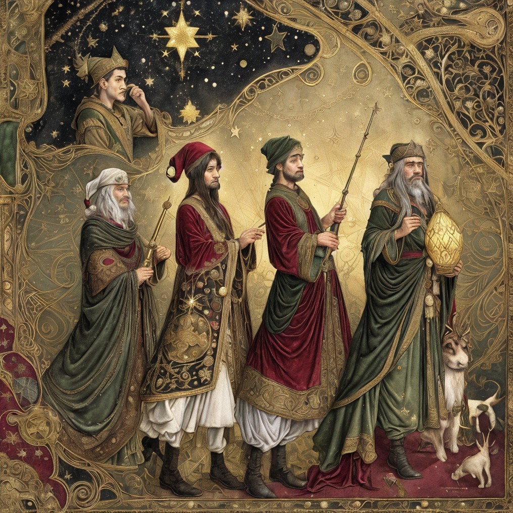 Legend of the three wise men and the the Christmas star,, 3rd century Persian miniature art. Velvet Black, Shabby, Dull Gold, olive green, burgundy, Golden Ratio, Surreal Fantasy, Elegant, High Definition Ultra Fine 3D Line, Zenangle Style, Watercolor Patchwork , Arthur Rackham Style, Paul Kidby, Gediminas Prankevicius, Jacek Jerka, Extremely Detailed, Intricate, Thoughtful, HDR, Fractal, Beautiful, Award Winning, Fantasy Look, Fantasy, Crisp Quality
