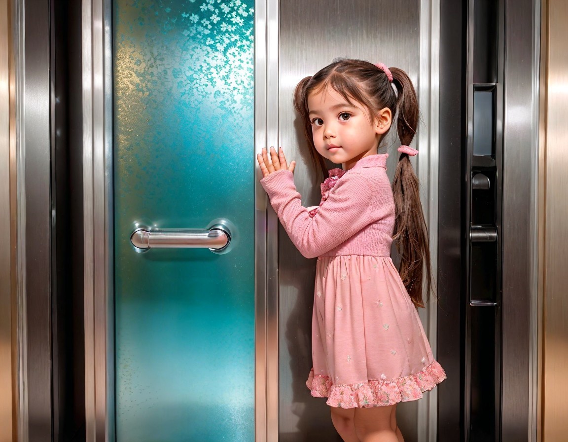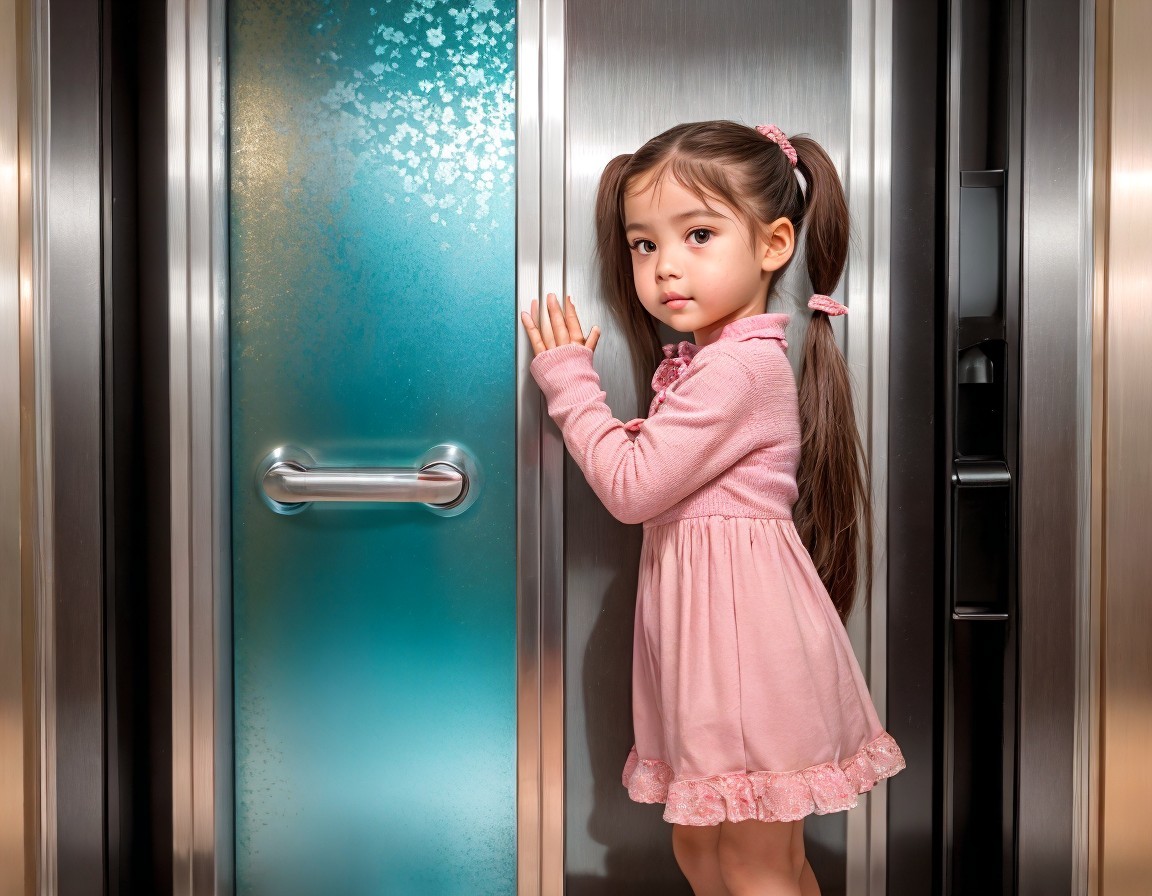 (EssentiallyRei) - A young girl with long hair stands beside a stylish door, wearing a soft pink dress. She looks thoughtfully at the camera, her expression curious and gentle. The background features a modern design.