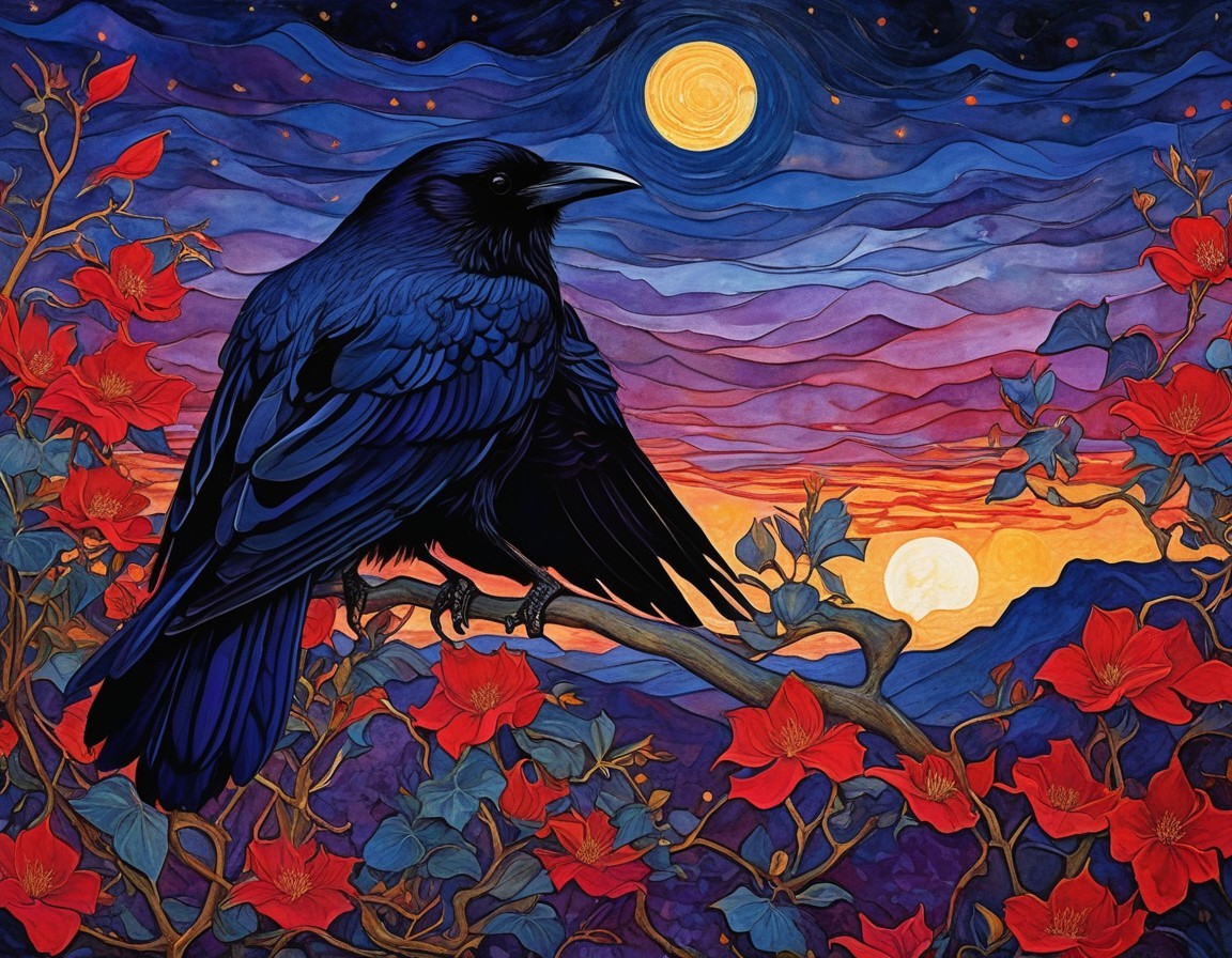 A vibrantly colored painting portrays a raven perched on a branch amidst red flowers with a swirling sky of blues and purples, featuring two luminous orbs.