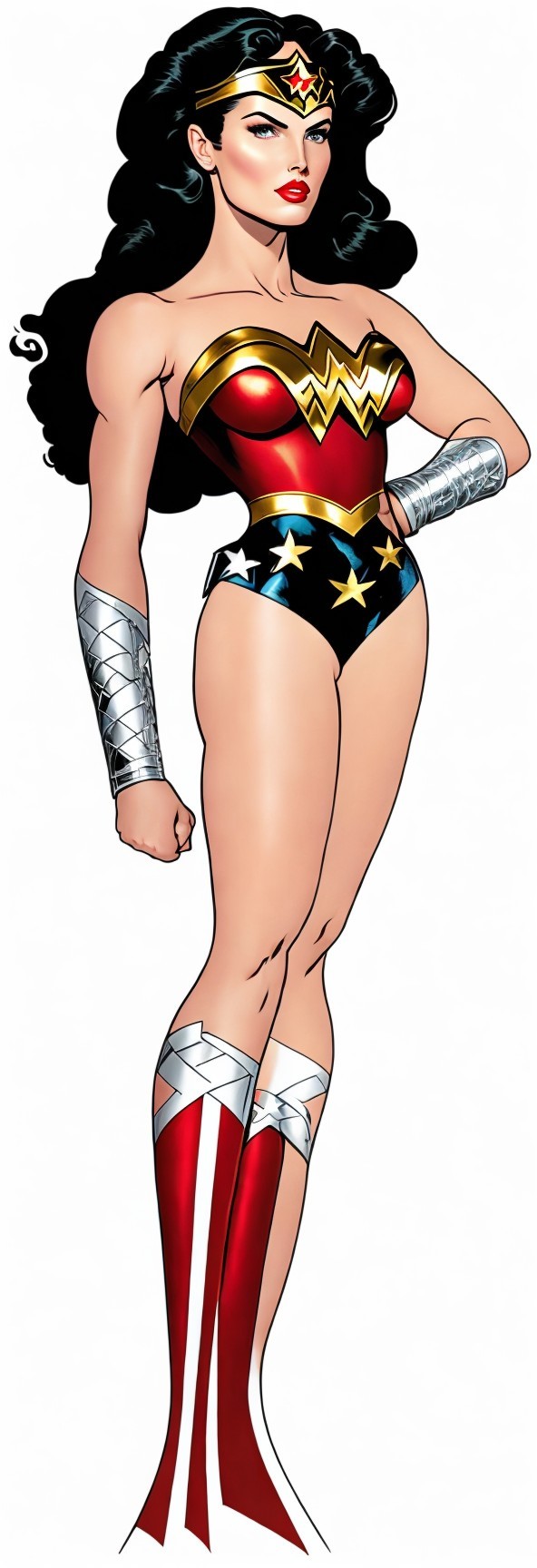 A woman poses in a vibrant Wonder Woman costume, featuring a red and blue bodysuit with gold accents, silver bracelets, and knee-high red and white boots, exuding confidence and strength.