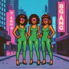 Three stylized characters stand together in matching green jumpsuits and black boots. They have distinct hairstyles: two with short dark hair and one with vibrant red, set against a spooky backdrop.