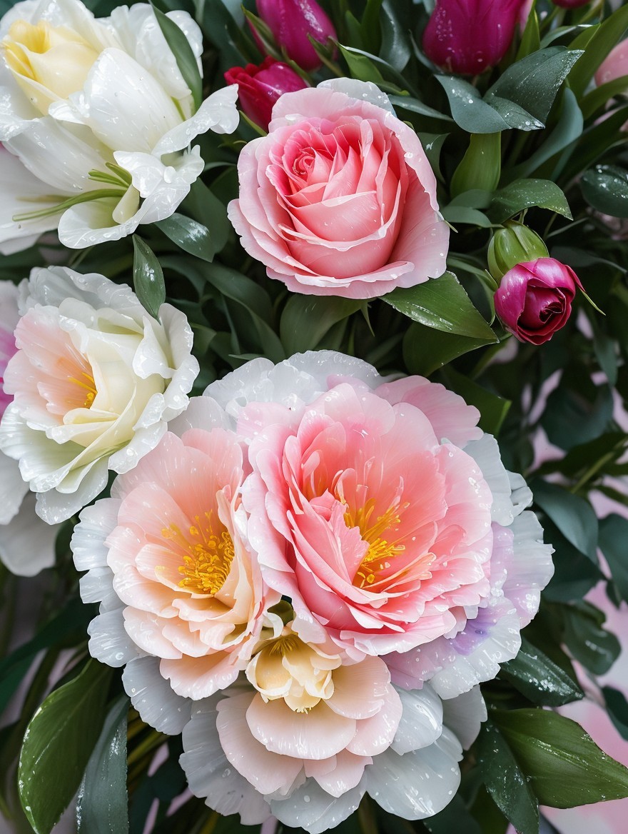 + Prompt:Generate a wet on wet vibrant color watercolor and ink of an image of a stunning bouquet of flowers, roses, Lillie’s, tulips, baby’s breath, painted in the style of Antoine Berjon. Include a 5-point black line frame outside of the image for added emphasis.
