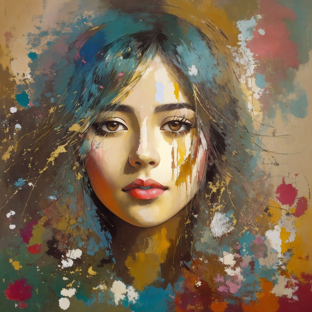 + Prompt:oil grunge-color chubby, “French perfection”, portrait with brush mark on white canvas illustration, in the hatched style of Vassily Kandinsky and Jeremy Mann, HQ, 4K, paint drips. Kintsugi style with gold accents, tints and patina