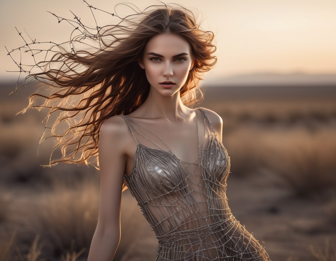Masterpiece, high detail, wire art concept, hazel eyes, long eyelashes, flowing hair, elegant entangled form, delicate wire strands, barbed wire attire, intricate wirework dress, spikes and barbs, sharp light, slender figure, hands on hips, contrast of innocence and harshness, dancing figure, alluring and dangerous, dramatic lighting, desolate wasteland background, resilience theme, vulnerability and protection, beauty and repulsion paradox, symbol of resilience, human spirit, mesmerizing spectacle, cautionary allure.