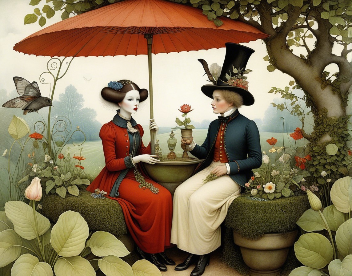 A woman with pale skin and striking features wears a bold red hat adorned with flowers. Surrounded by lush greenery and butterflies, she gazes thoughtfully, embodying a blend of elegance and nature.