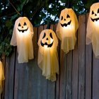 A festive Halloween scene featuring illuminated pumpkin lanterns strung along a wooden fence. Each pumpkin has a cheerful face and a black witch's hat, creating a playful autumn atmosphere.