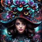 A striking fantasy portrait features a person with shimmering turquoise skin, intricate spider web patterns, and dramatic makeup. The ethereal lighting creates a mysterious, enchanting atmosphere.