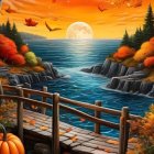 A serene landscape features a calm lake surrounded by vibrant autumn trees. The setting sun casts a golden glow, reflecting off the water, while a lone bird glides peacefully.