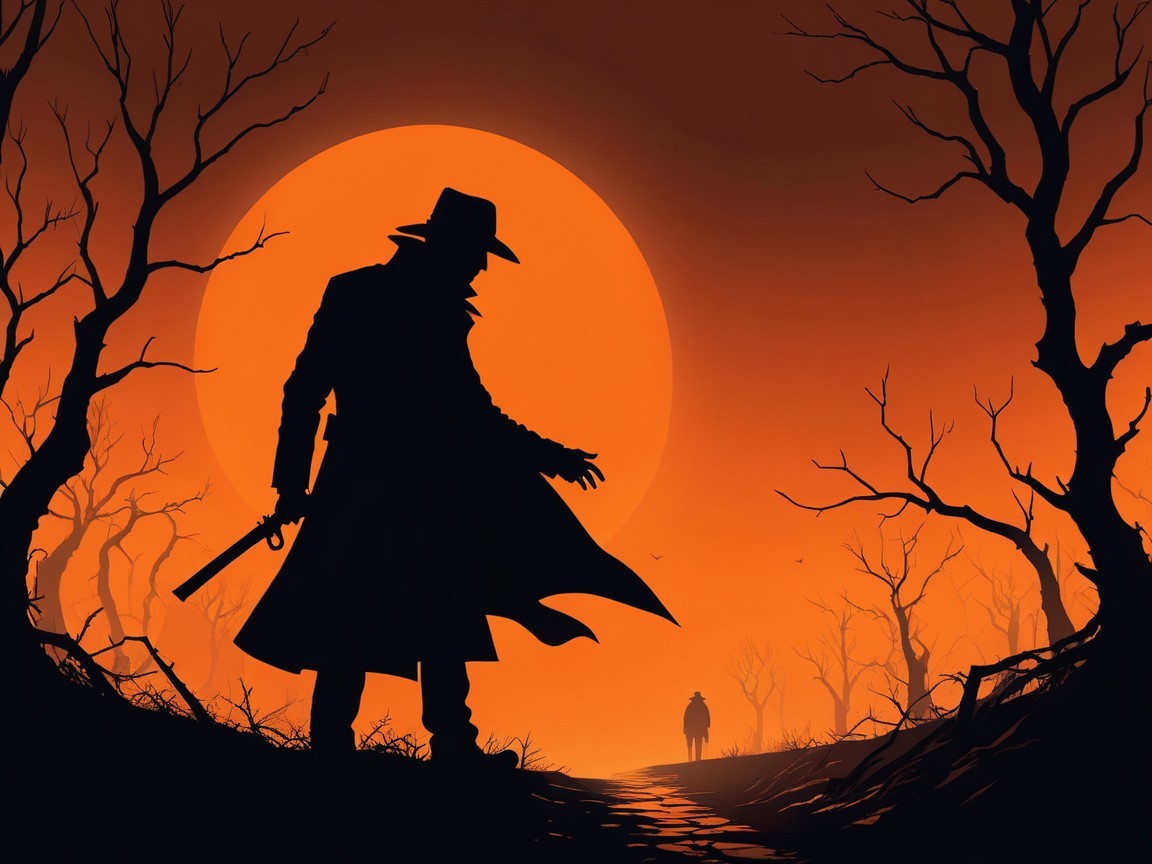 A striking silhouette scene unfolds at sunset, featuring a cloaked figure with a sword and a smaller figure in the distance. Twisted trees frame the eerie landscape, enhancing the atmosphere.