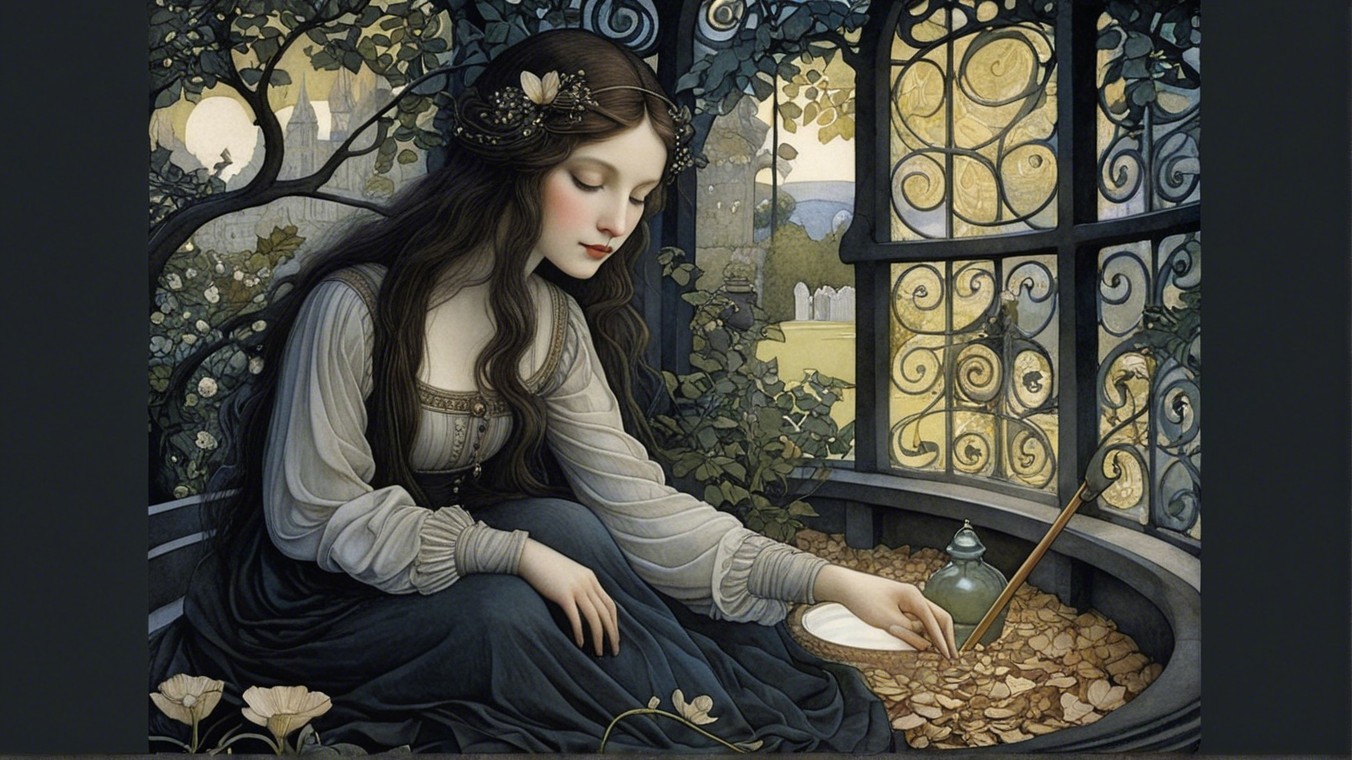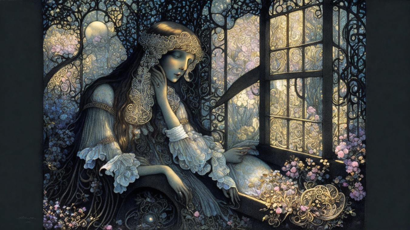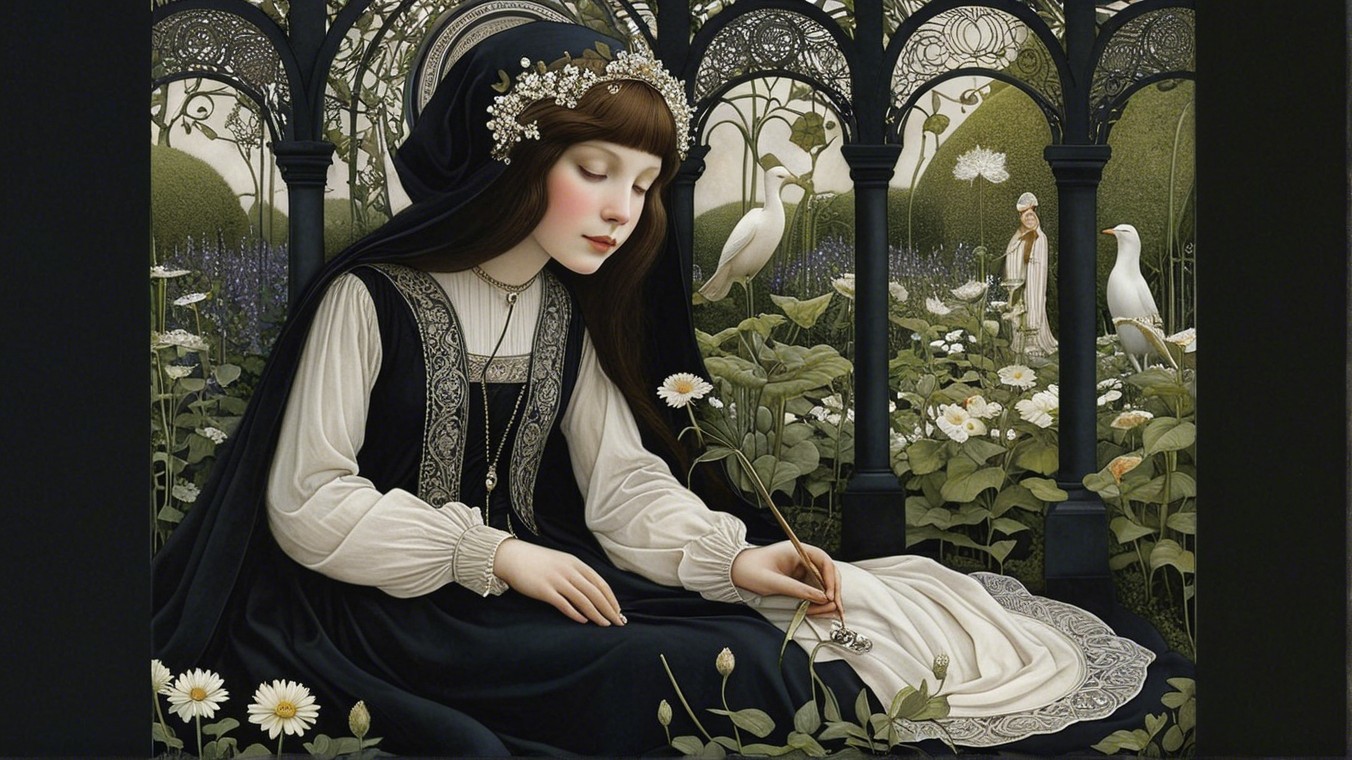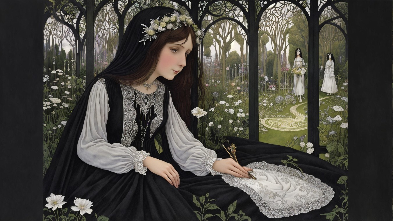A young girl in a dark dress sits among blooming flowers, lost in thought. She delicately holds a piece of fabric, with intricate patterns framing her serene expression and lush garden backdrop.
