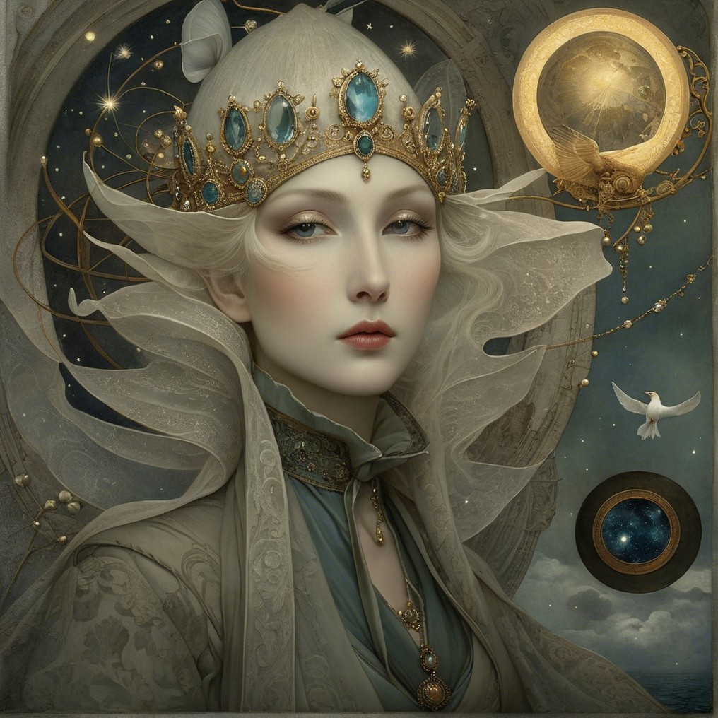 A graceful woman in flowing white fabric sits elegantly against a dreamy backdrop, cradling a moonlit orb. Her hair is adorned with feathers, embodying ethereal beauty and serenity.