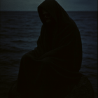 A mysterious cloaked figure sits on a rock in a foggy, dark landscape, surrounded by water and jagged cliffs, exuding an aura of solitude and enigma in the dim light.