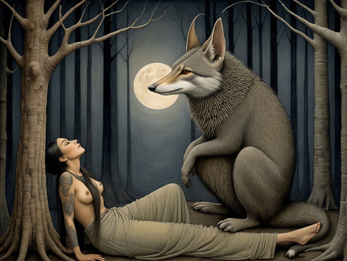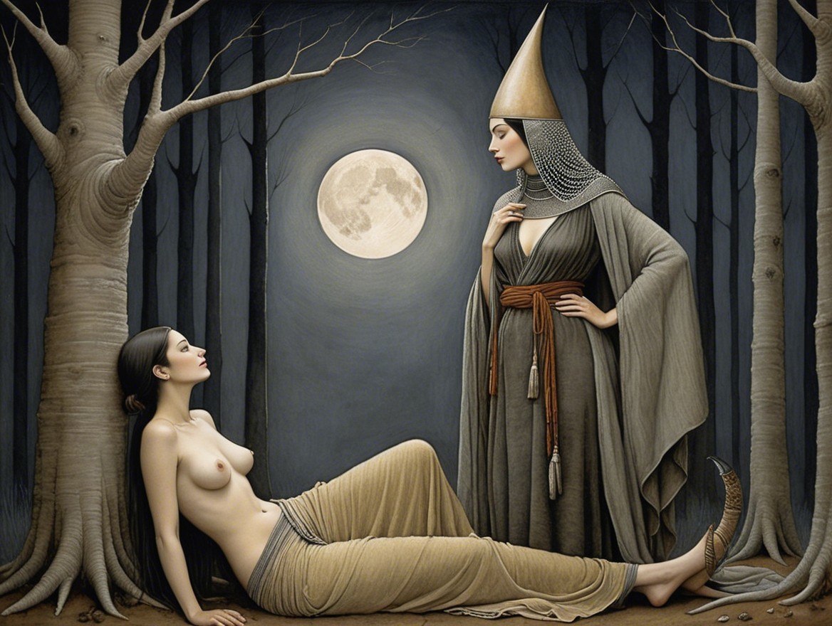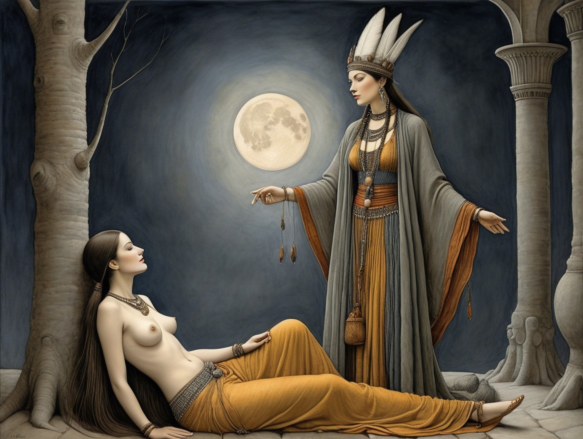 The painting depicts two ethereal women, one seated in a golden outfit, gazing up at another in flowing robes, illuminated by a radiant, circular light in a serene, mystical setting.